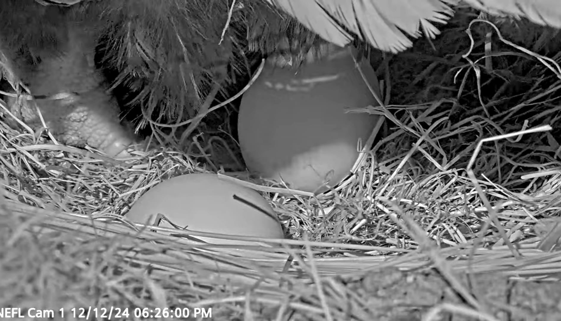 Gabby laid NE26 on December 17th at 5:18pm, shortly after Samson flew in with a fish and got his first view of the newly laid egg. On December 20th at 7:06pm NE27 was laid.