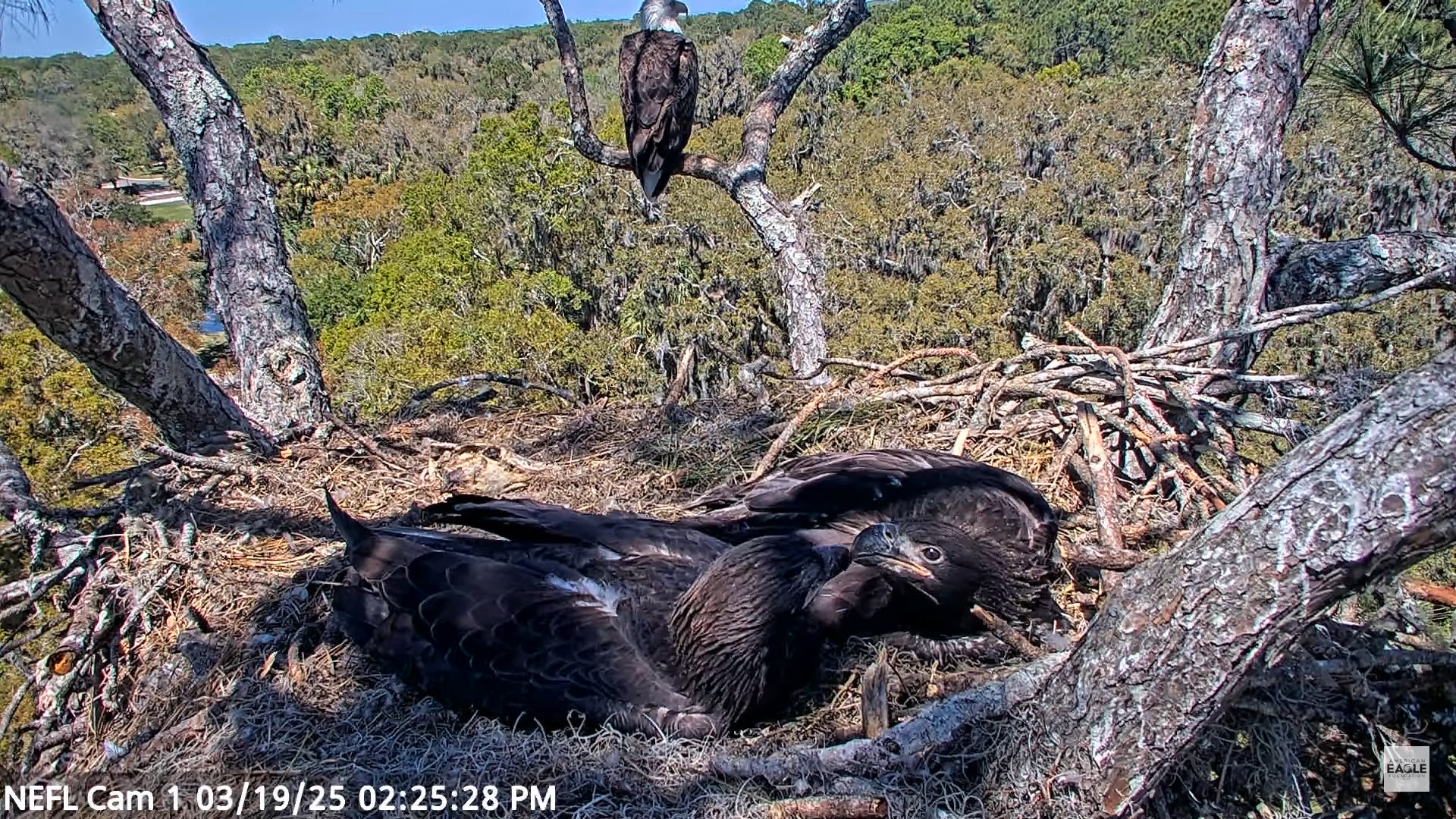 Then, on March 19, 2025, an unexpected twist unfolded. A fledgling eagle appeared at the nest. At first, there were a few scuffles between the newcomer, Bodie, and even Beau, but things quickly settled. The juvenile spent time coming and going freely, often lying beside Bodie or sharing meals with each other.