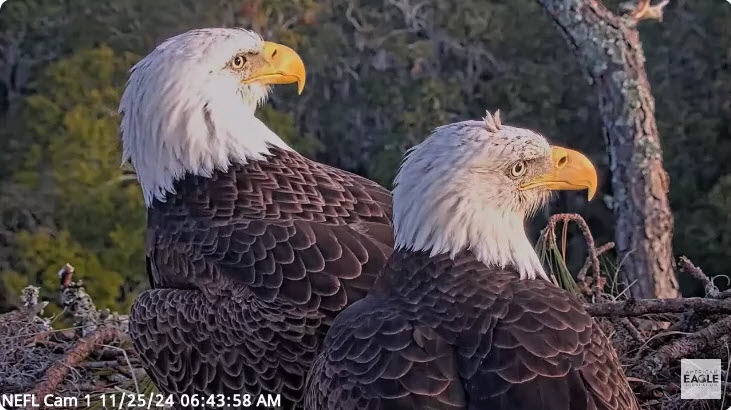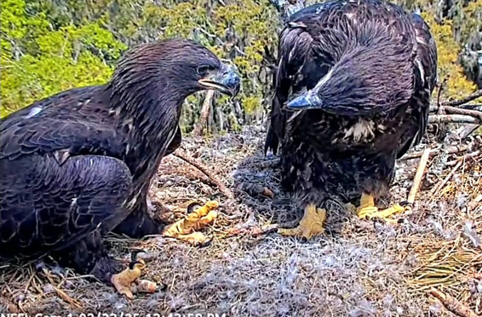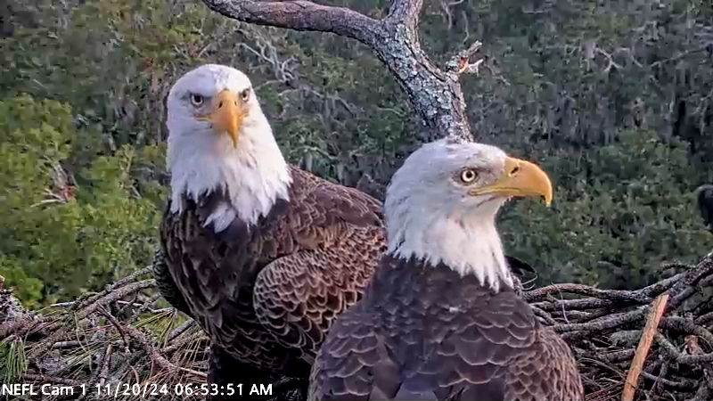 They’ve frequently roosted through the night at the nest or in a tree together close by. It’s a joy seeing their union grow with the seasons. They’ve been seen mating and frequency increased as they lead us into the next part of the nesting season.